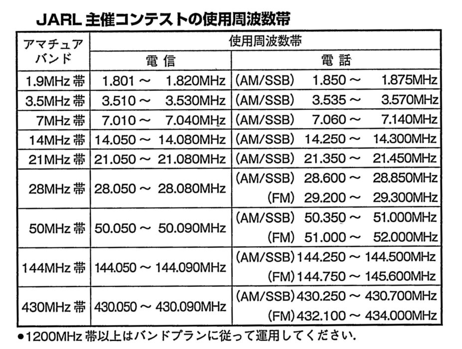 JARL主催コンテスト(ALL ASIAN DX、QSOパーティを除く)では、1.9MHzから430MHz帯において、コンテストに参加しない局にも配慮して、電波型式ごとに「コンテスト使用周波数」を次のように設定しています。この周波数表記は、バンドプランの周波数表記方法と同じで、各周波数は電波のスペクトラムの境界を表わしています。