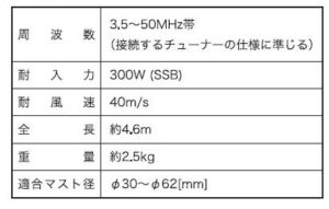 使用には各社の屋外型ATUが必要で、無線機内蔵のチューナーや外部の手動式チューナーでは使用できません。また屋外型ATUにはアース(ラジアル線など)の接続が必要になります。耐入力は300W(SSB)。