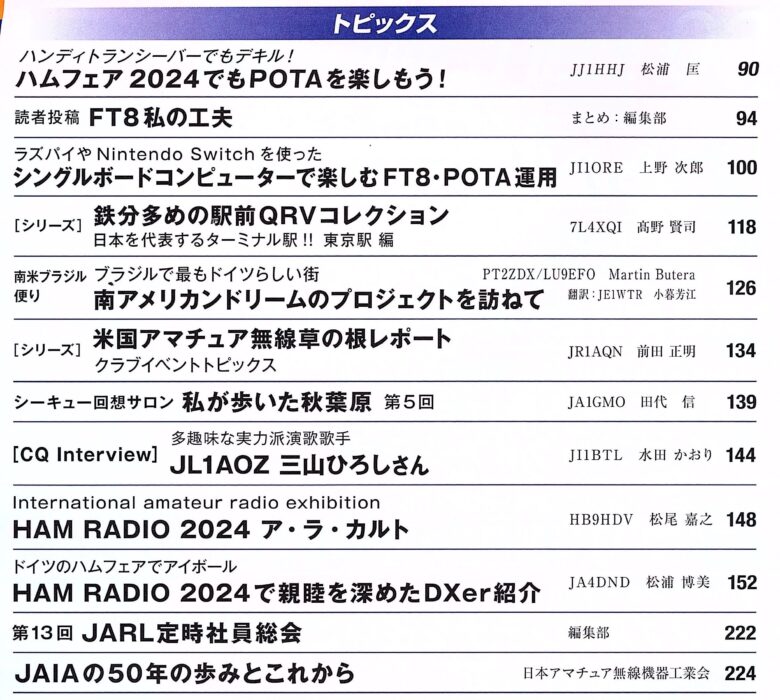 特集”アクティブハムが勧める~わたしのアンテナスタイル”です。さらに「CQインタビュー 多趣味な実力派演歌歌手 JL1AOZ 三山ひろしさん」「HAM RADIO 2024 ア・ラ・カルト」「新しいFT8マルチモード誕生 SuperFox modeについて」「ハムフェア2024でもPOTAを楽しもう」といった記事も掲載しています。