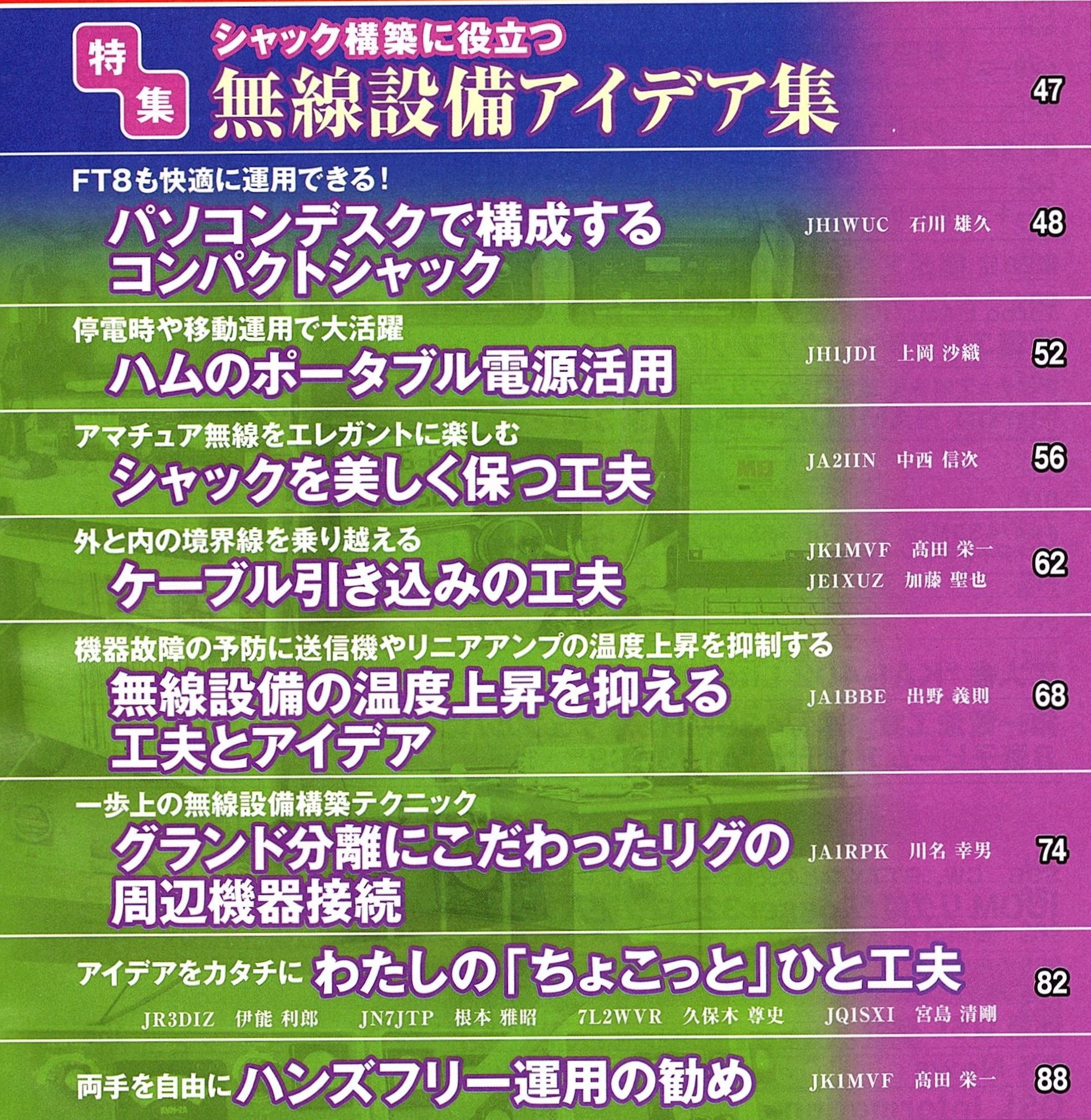 今回の特集は、無線機収納用の木工BOX制作、マイコンでモールス信号クイズマシンの制作、ジャンク品の活用など、幅広いノウハウが公開されていて、大変興味深いです。