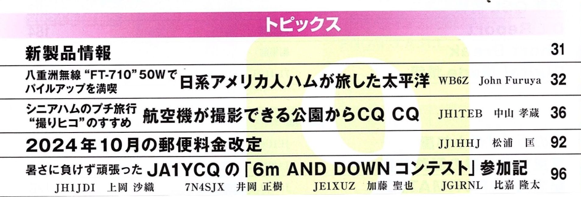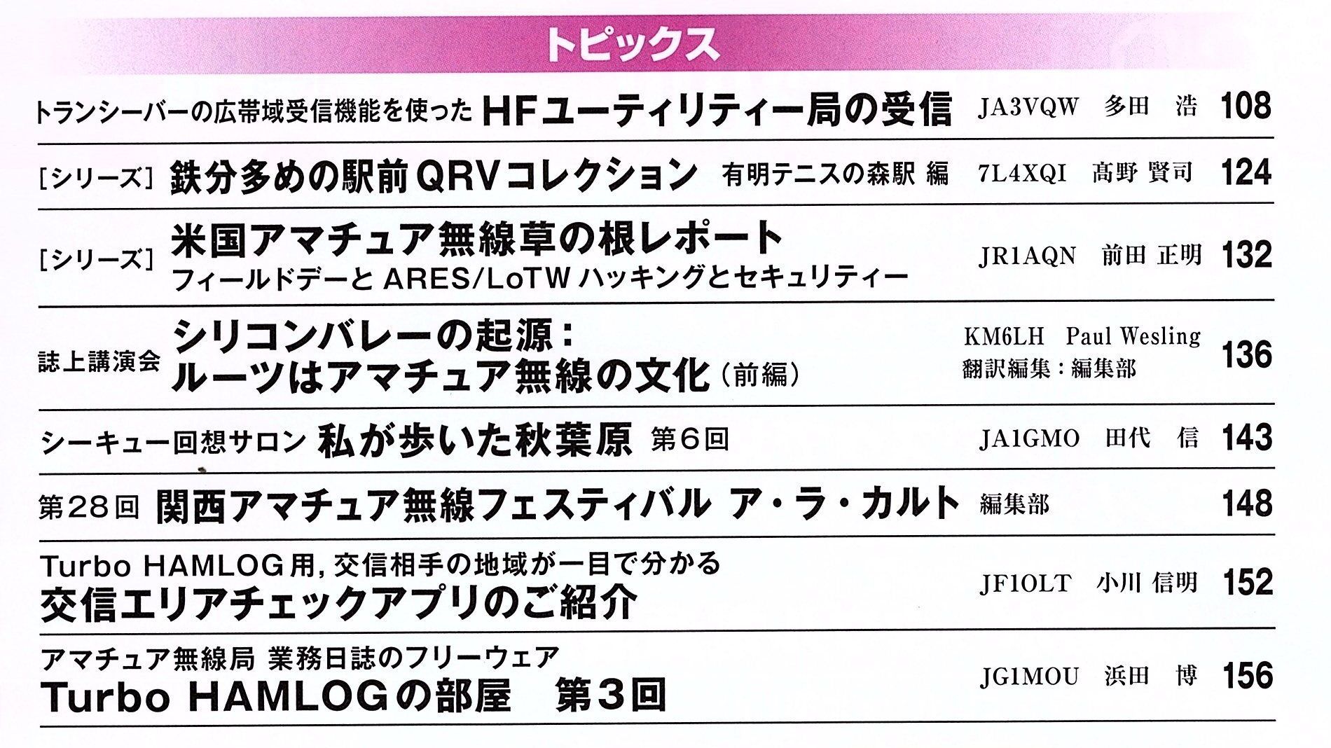 注目記事としては、さらに「日系アメリカ人ハムが旅した太平洋」「航空機が撮影できる公園からCQ CQ」「ファーストインプレッション アイコムID-52PLUS」といった記事も掲載していました。