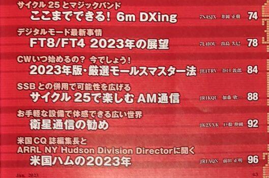 前半は、「続けよう!お正月の20局更新~QSOパーティから始める2023年」、「2023年のHF電波伝搬~今春の注目局はこれだ~TN8K(コンゴ共和国)の運用が1月6日から始まります。」が興味深いですね。