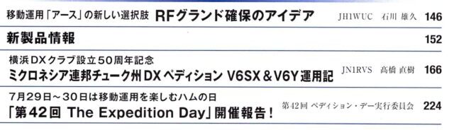 紹介した他にも「CW運用ステップアップ(120p)」「入門ハムの英会話(138p)」が連載中です。QSL INFORMATION(194p)」、「国内・海外コンテストカレンダー(214p/216p)やコンテスト規約(218p)」も、毎日の運用には欠かせません。