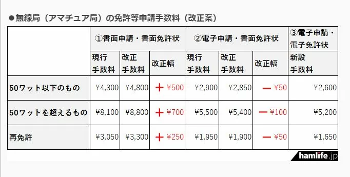 今回の手数料改定の中で、特にアマチュア局に影響があるのは、「書面申請・書面免許状」と「電子申請・書面免許状」の手数料の変動です。