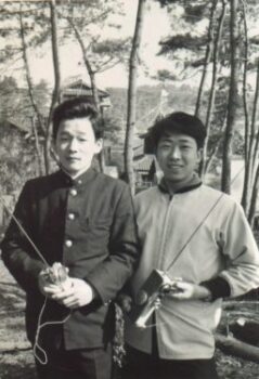 高校修学旅行のために作った50MHz帯ハンディー機。全然使い物にならなかった印象。左は親友のJA3CZI局(坂元さん)。